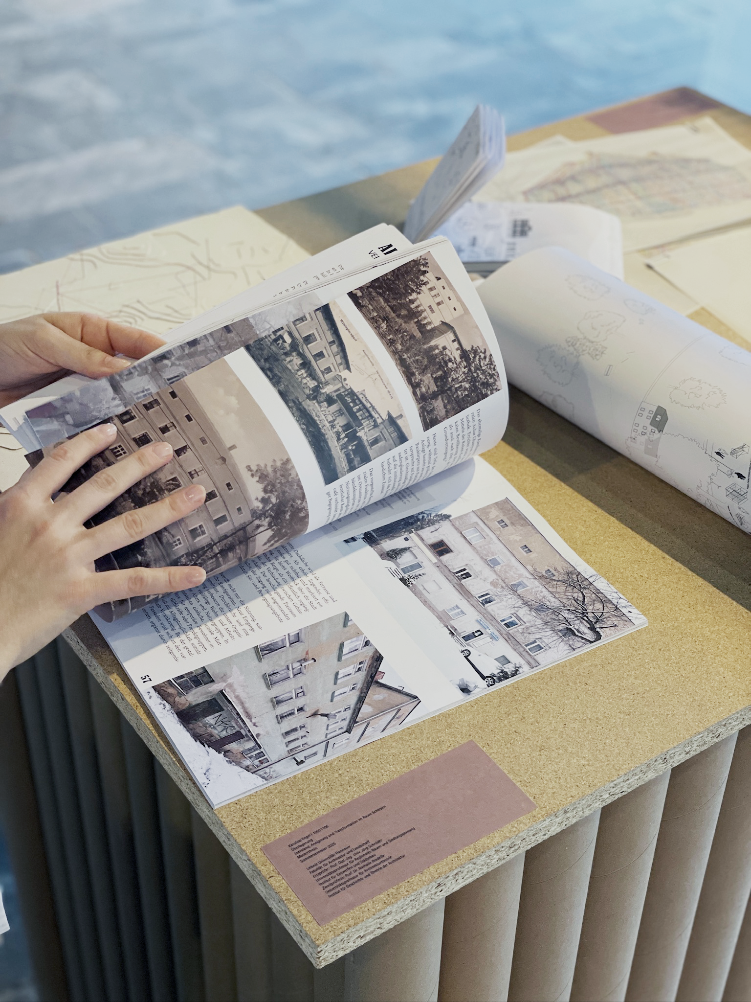 The thesis is presented as a spatial installation that translates the conceptual steps into an immersive, physical experience. Hanging translucent textiles, fold-out plans, drawings, and interactive elements allow visitors to move through layers of memory, transformation, and appropriation. The exhibition stages the idea of Überlagerung not only as a theoretical framework, but as a spatial practice – making the complexity of history and the potential of vacant spaces both visible and tangible.