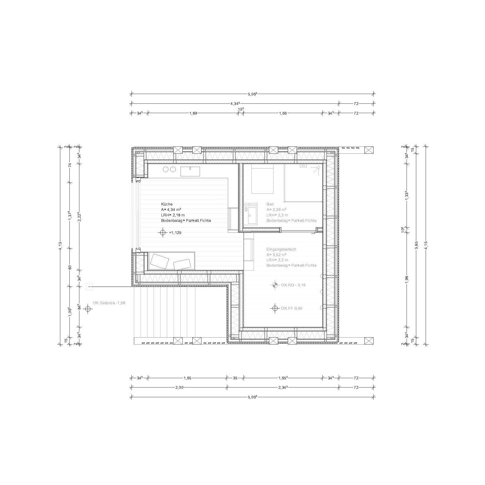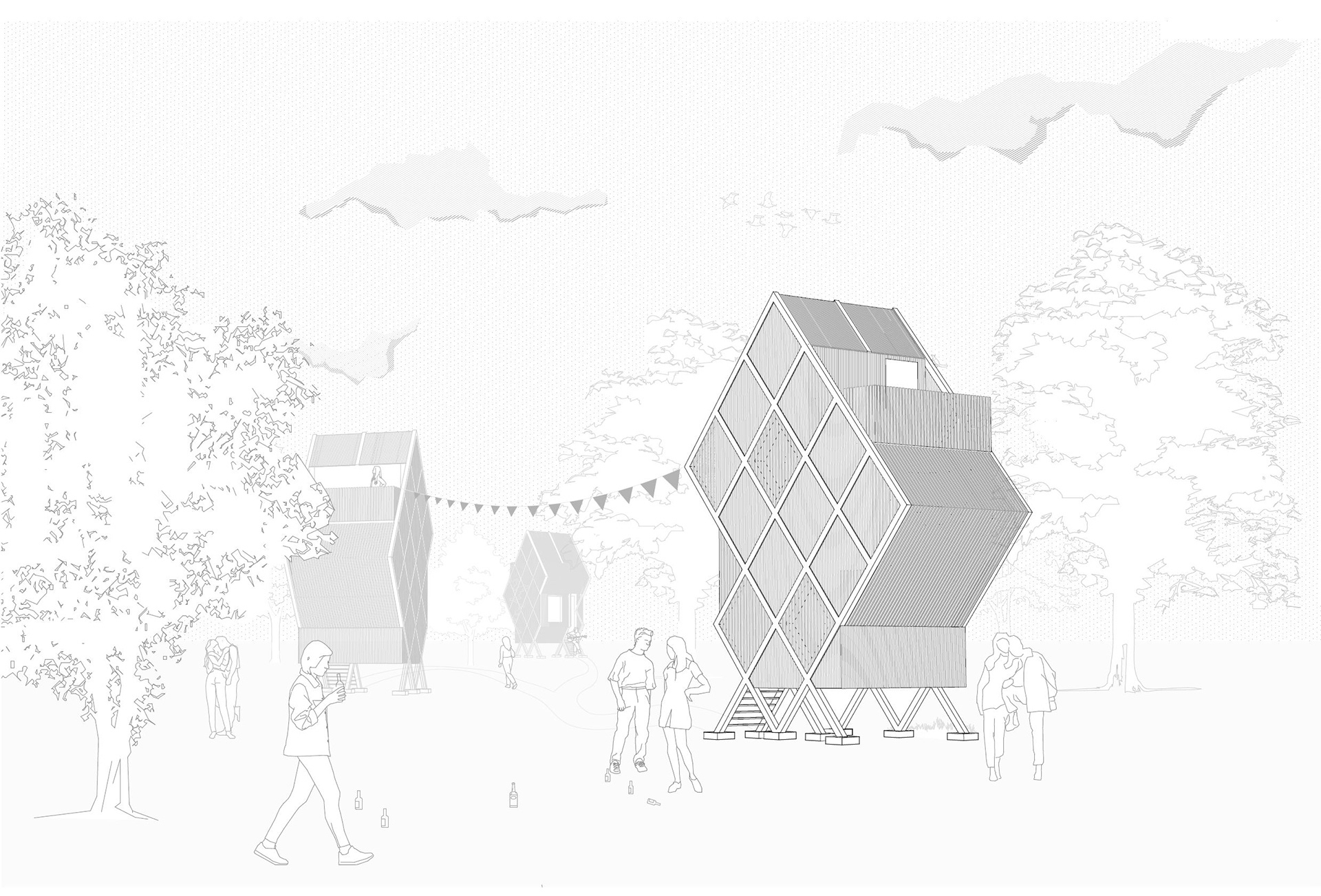 Komorebi is a Japanese word for sunlight that is filtered through the leaves of the trees. This effect is also created in our design and thus gave the wooden building its name. For the annual Apple Tree Garden Festival in Germany, there is a need for sleeping accommodation for artists and crew members in the back-stage area of the site. Compact wooden buildings are to be created here with the smallest possible footprint, nestled among the trees on the site. With the design we opted for permanent buildings that will be used as youth hostels alongside the festival. This is intended to give the park a new use and enhance its value. With a minimal footprint of just under 30 m², up to eight people will be able to spend the night, relax and recharge their batteries. The design was inspired by the trees. Its supporting structure represents the trunk and branches of a tree. The wooden supports stand at an angle and support each other. Thus the load is transferred in different ways. This alignment creates rhomboids that can grow upwards depending on the space available. Levels are inserted at the intersections of the supports. These form the different used areas of the design. You move from one area to the next via them, as if through a tree, using short stepladders. From the entrance area, with the cloakroom and the small bathroom, one reaches a small kitchenette. Further up are the first four sleeping accommodations, which are attached as bunk beds in a rhombus each and form part of the supporting structure. This is followed by two more sleeping accommodations, after which one finally reaches the roof terrace at the very top. The façade is intended to reflect the foliage of the trees. The interlocking spruce cladding runs once across the design and is set between the rhombuses. Where there are windows in the rhombuses, only every second batten is set, creating the eponymous effect of light in the dormitory. Faculty of Architecture and Landscape