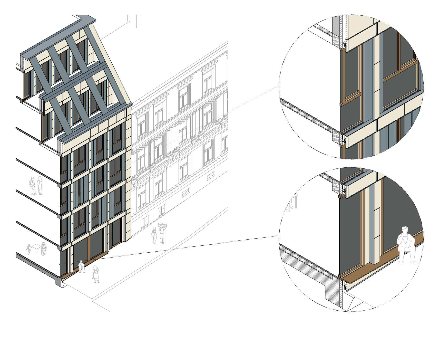 Situated in Maridalsveien 48, Oslo, this infill project redefines the relationship between light, materiality, and spatial adaptability in a dense urban context. The design embraces an open, flexible layout while integrating sustainable strategies that enhance both environmental performance and user experience. The structural concept is based on two firewalls, which simultaneously level the site and frame the building. A timber column and beam system is introduced along the long sides, supporting pre-stressed π-slabs that span the full 10.5-meter depth of the building. A modular 2-meter column grid divides the space into seven equally sized zones, enabling a highly adaptable interior layout. The fifth and sixth floors are stepped back, reducing the building’s visual impact on the street and creating terraces with views of the city. The stairwell and lift core are positioned at one of the narrow sides, leaving the rest of the floor plan open for varied programmatic uses, realized through lightweight partitions. A key architectural feature is the curtain wall façade, designed with floor-to-ceiling sliding windows, allowing for maximum daylight penetration, natural ventilation, and visual openness. The façade fenestration is carefully aligned with the structural grid, ensuring a seamless interplay between interior and exterior. Vertical pilasters express the underlying column structure, reinforcing a sense of rhythm and coherence, while the horizontal floor slabs are subtly reflected in the façade articulation. The design incorporates a dynamic solar shading system that balances aesthetic refinement with functional adaptability. These sliding shading elements not only control glare but also integrate photovoltaic panels from the third floor upwards, actively contributing to the building’s energy efficiency. The angled photovoltaic modules on the stepped-back floors are positioned at a 50-degree incline, echoing the roofscape of surrounding historic buildings while optimizing solar gain. This integration of sustainable energy production with architectural expression highlights the project’s commitment to responsible urban development. By combining modularity, transparency, and passive energy strategies, the project presents a refined and context-sensitive approach to contemporary urban living. It successfully balances daylight optimization, spatial flexibility, and sustainability, offering a dynamic yet harmonious response to its Oslo city setting.